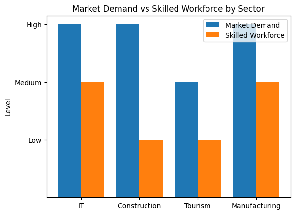 However, many sectors still face a significant gap between the demand for skilled workers and the available trained workforce. As illustrated in the graph below, industries such as IT, construction, tourism, and manufacturing require more skilled workers than are currently available. This imbalance slows down business growth and limits the full potential of economic sectors.